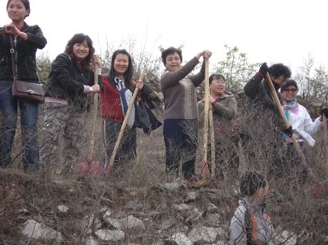 | 到了場地后,各位老師迅速開始了熱鬧朝天的植樹活動。 | 每位老師一棵樹,種下自己的愛心樹。 |